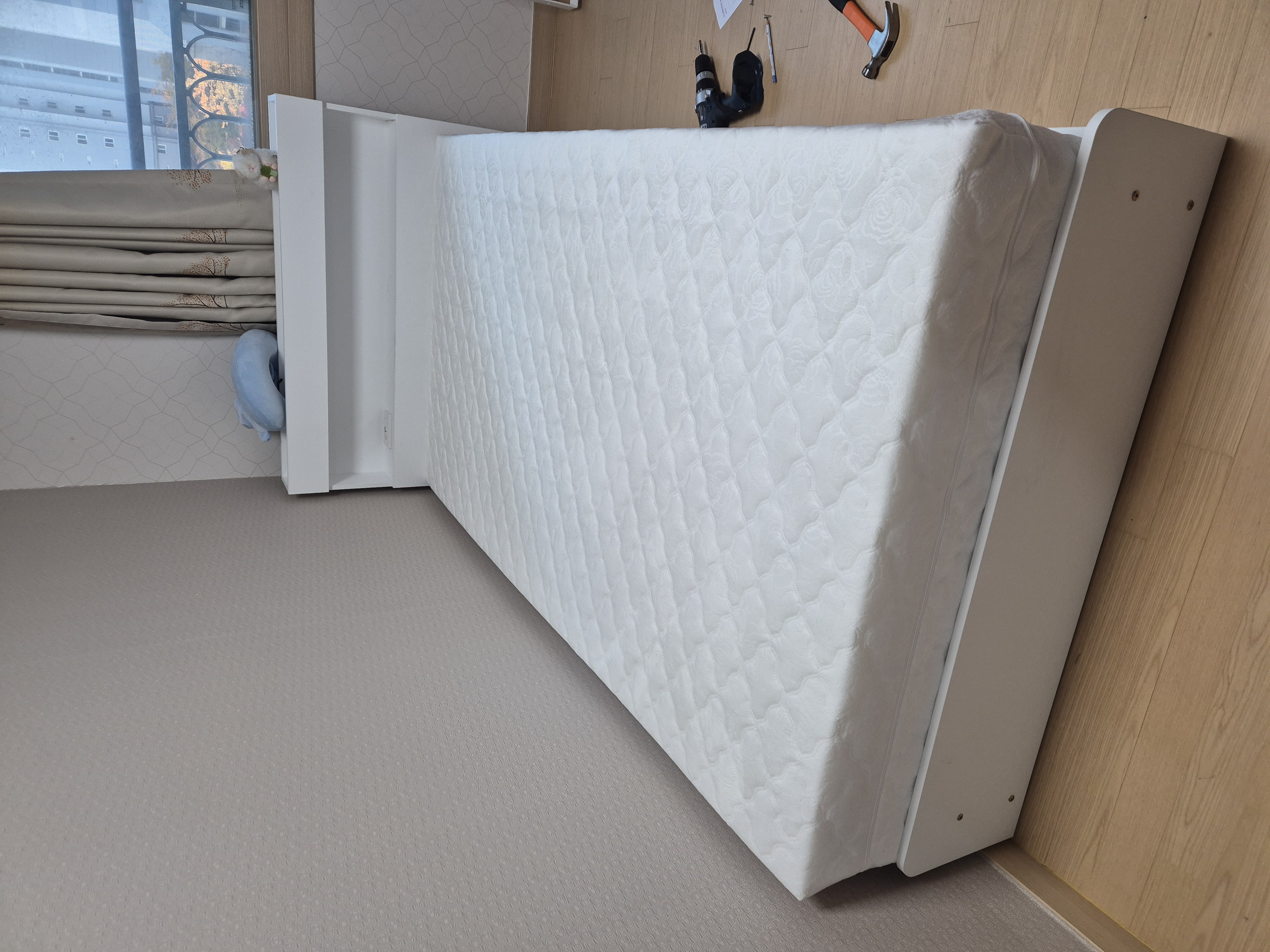 서랍형 침대라서 조립이 금방끝났어요. 아래받침이 있는 서랍형 이다보니 서랍높이가 좁아요. 아무리 한샘몰 뒤져봐도 이것뿐이더라구요. 선택의여지가 없었음. 배송비6만원 드렸어요.