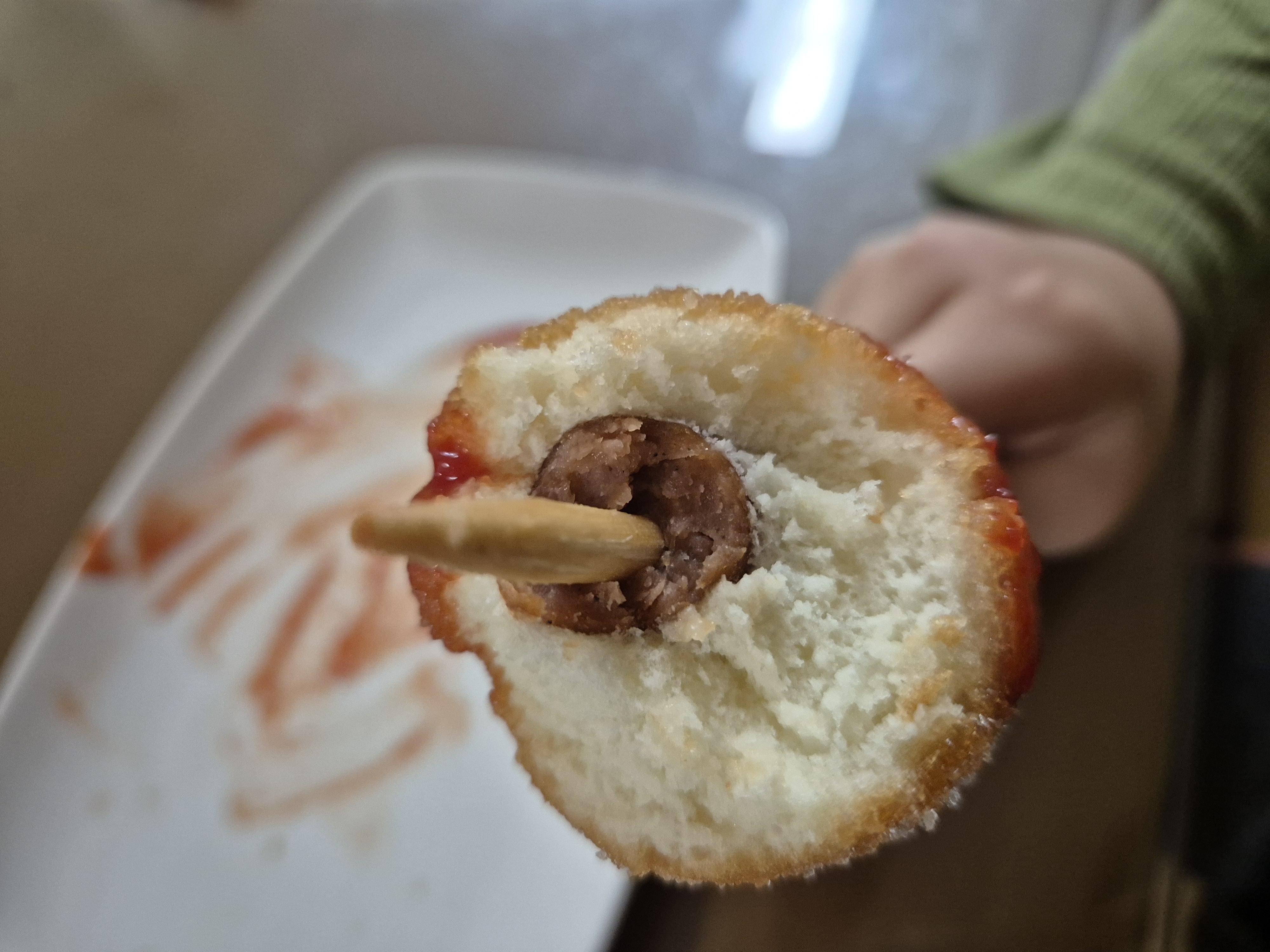 오늘 아이가 먹다가 힘들어해서 남겨도 된다고 했어요. 핫도그를 봤더니 밀가루만 잔뜩이네요. 소세지랑 밀가루 비율 보이죠?